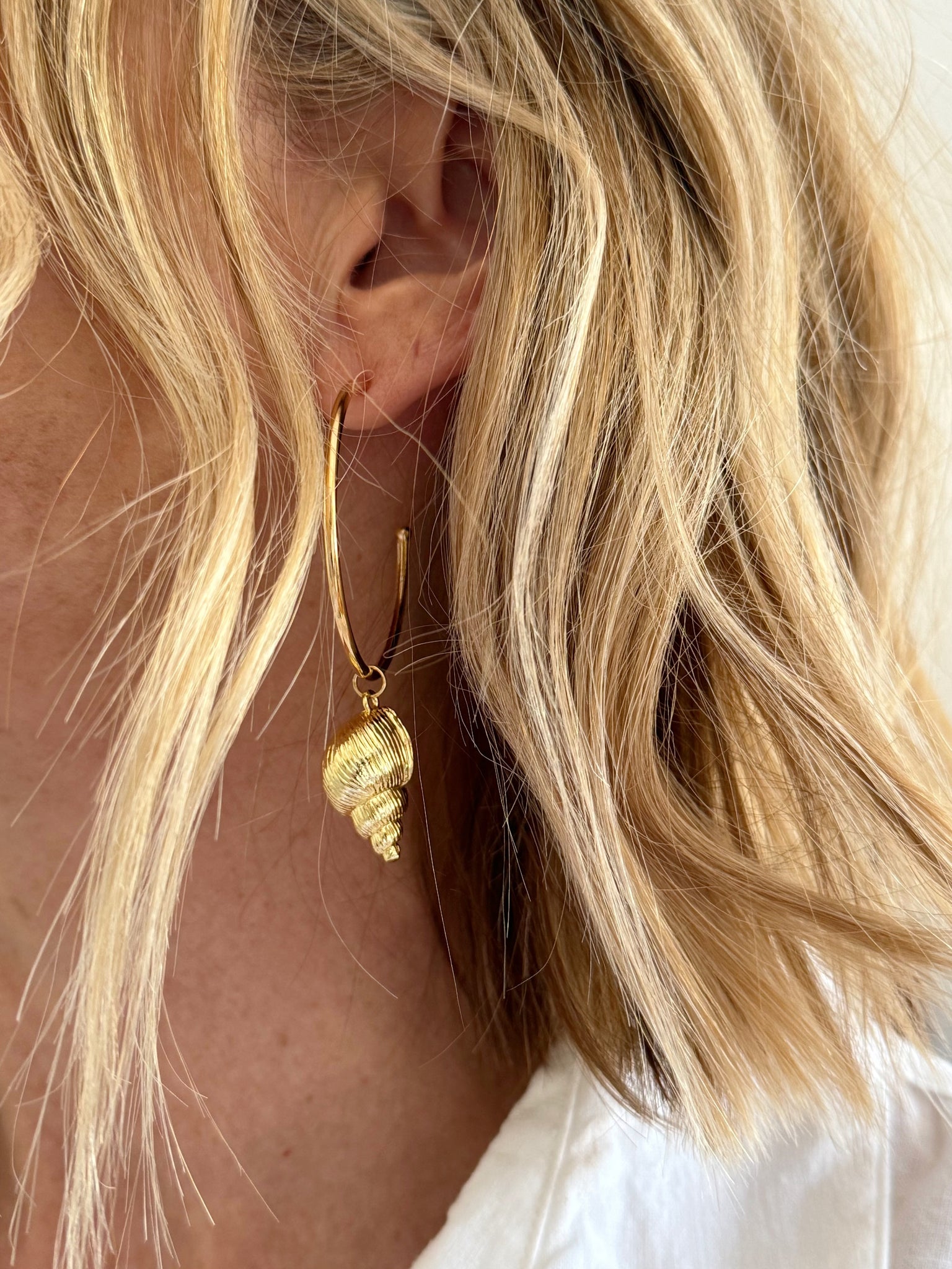 Gold filled hoops with shell drop pendant.