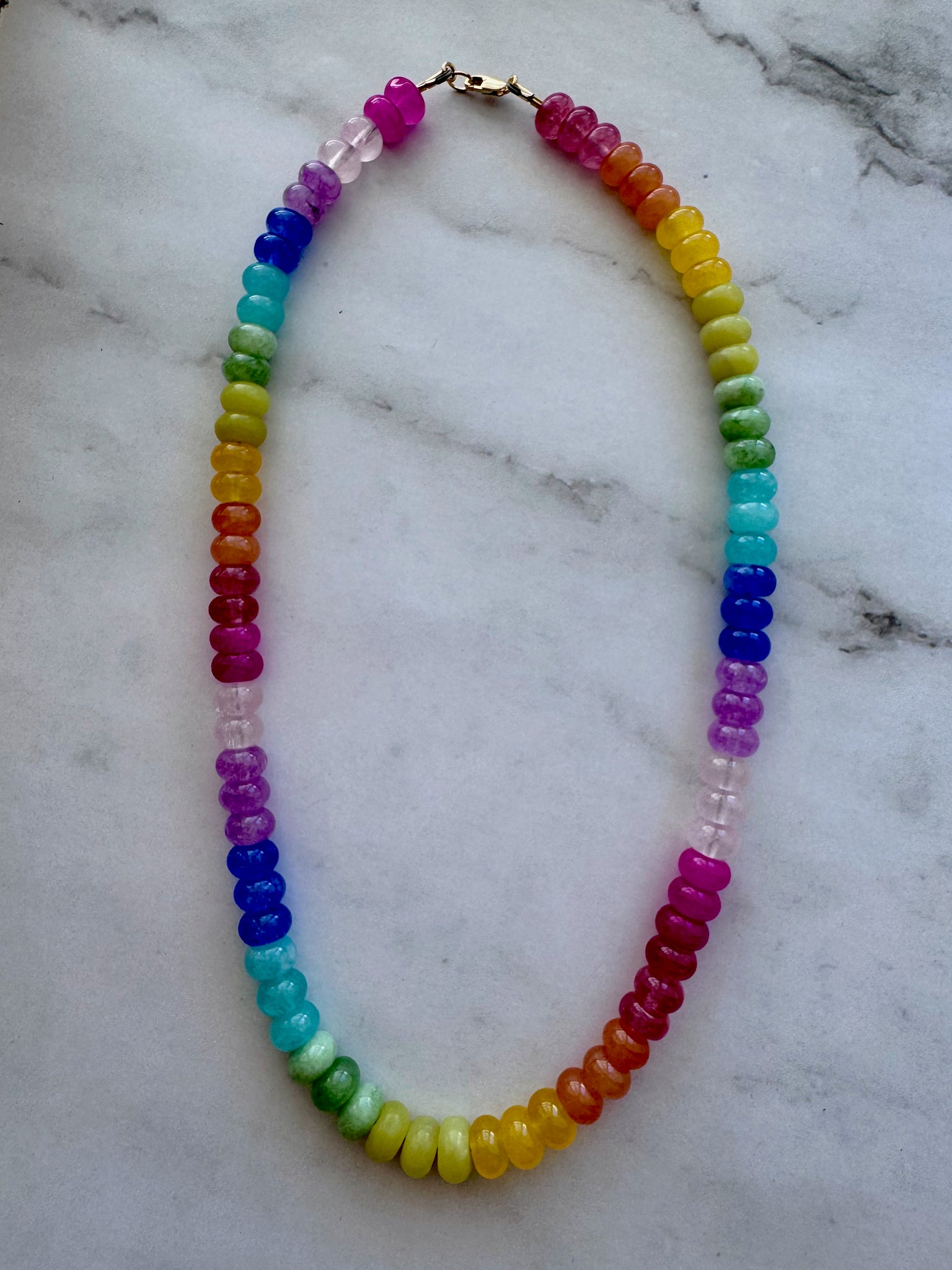Chunky, colorful beads make a statement for the season. Dyed jade beads in a rainbow of bright colors make a necklace that is perfect for layering and adding a pop of fun to your necklace stack.