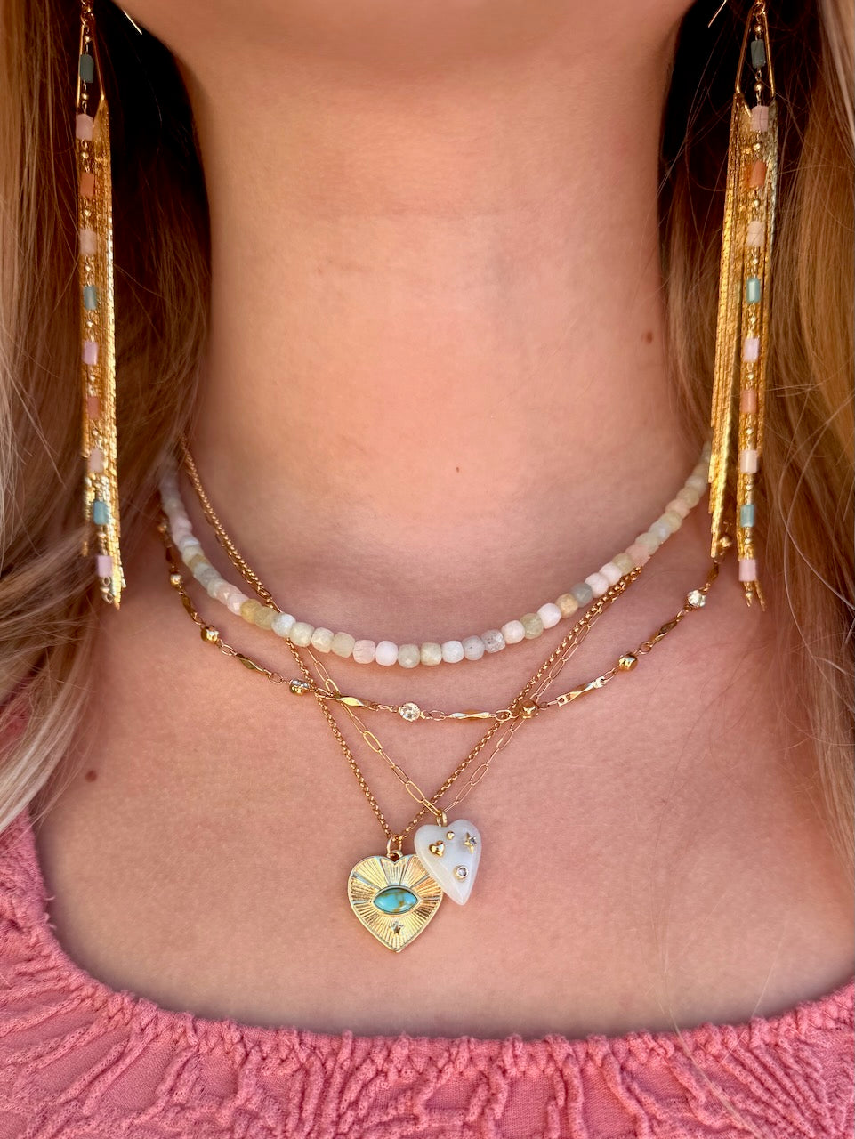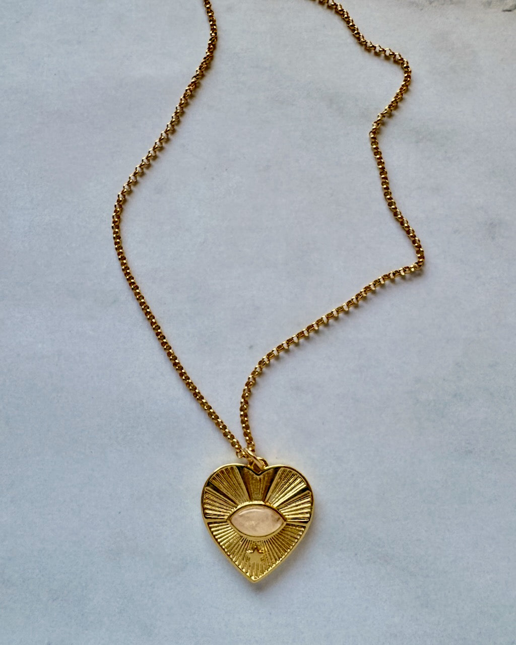 Vintage inspired gold heart pendant with your choice of natural rose quartz or turquoise, on a classic textured rolo chain. Great for layering and creating a personal neck stack!